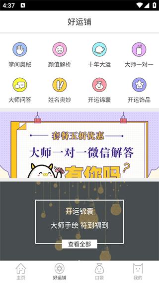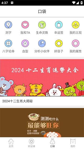 4、【口袋】页面则是提供了多种运势分析功能,如测字、前世今生、生命灵数、生日密码等。