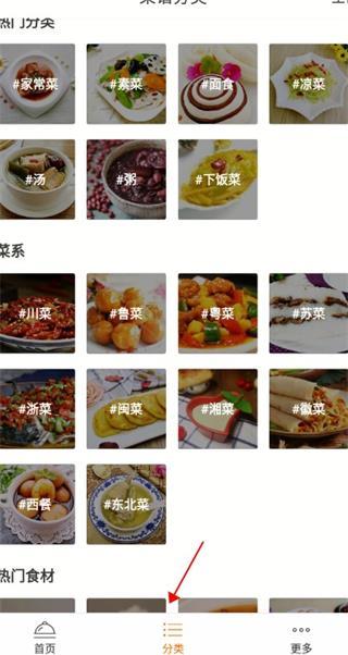 2、点击分类,可以看到早餐、菜系、热门食材等;