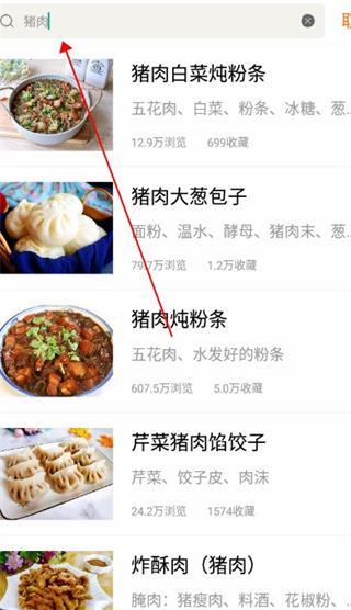 3、选择热门食材,点击肉类,选择猪肉后会出现众多以猪肉为原料之一制作的菜品;