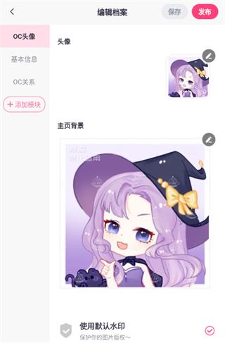 你可以在特盐app中自定义编辑OC档案信息,精美的OC主页模板等你使用,每一个原创角色创作者可以在平台上发布自己的OC作品,并且支持OC图片水印覆盖,保护崽崽的肖像权!(OC的全称是“original character”,一般指原创角色)