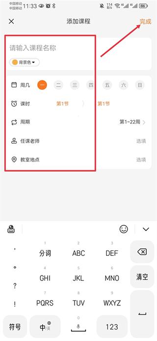 4、最后将课程名称、周几、课时、任课老师、教师地点等信息完善后点击完成即可