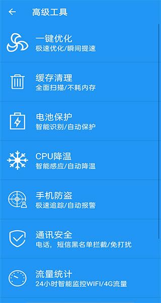 2、更多功能:一键优化、缓存清理、电池保护、CPU降温、手机防盗、通讯安全、流量统计、进程管理、设置。