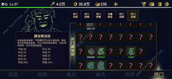 2、先刷开局号,在师门,古墓探宝里面看看有没有极品装备或者极品功法