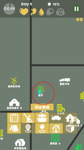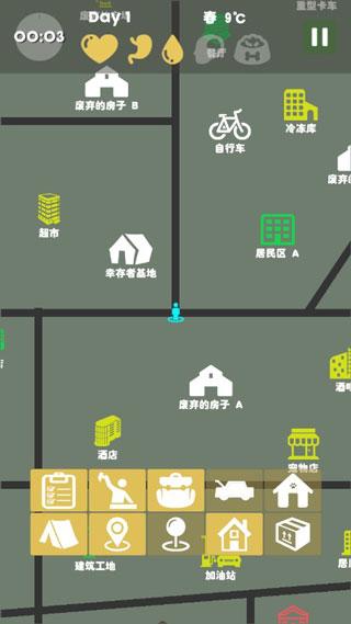 白色的建筑虽然没有危险,但是能获得的资源也是最少的,我们可以去探索一下绿色建筑,例如餐厅、超市等,这些里面往往会有食物,这样就能填饱肚子了。