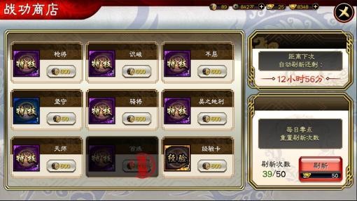 累计获取的战功,可以通过“战功商店”购买心仪的蓝色/紫色武将特技卡,可以传授给自己武将,让武将战力得到进一步提升!同时还有几率刷新出橙色武将经验卡,一张橙色武将经验卡可以给武将带来非常可观的经验值,千万不要错过!