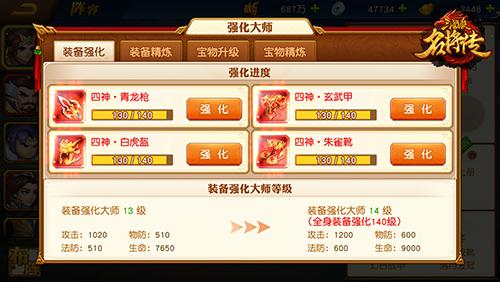 4、一个武将的四个装备部件同时强化到一定等级,可激活强化大师效果,获得额外属性加成。