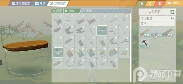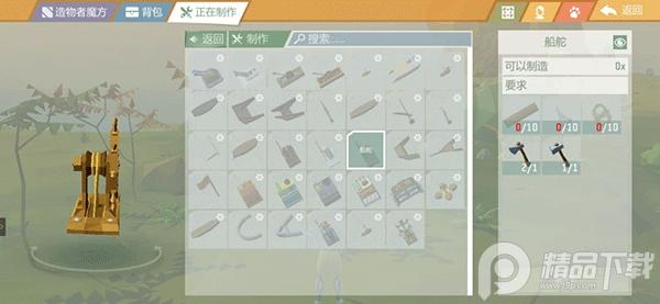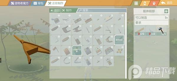 船体主要组件有:船舶、船舵、船锚、带帆桅杆、船体前部、船体后部,总计6种不同的组件。需要的材料和工具主要有:原木、钉子、布、任意绳子、任意锤子、裁缝工具箱、木板、任意斧头、任意锯子等。而这些东西,正是需要岛主们通过之前建造出的工作台来制作。