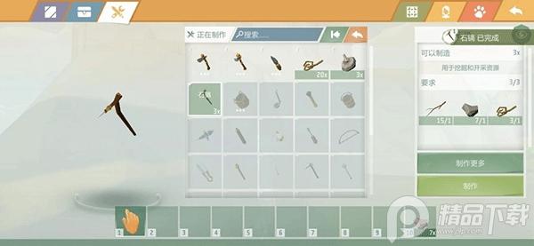在探索模式中,在出生岛开始游戏后,大家都是一无所有的状态,因此为了能够在岛屿上更好的生存,我们首先需要跟随新手引导做出一把石斧,无论是砍树,还是狩猎都是非常实用的工具。岛主们只需要在地面上拾取【石头】、【木棍】、【燧石】、【草】等最基础的材料,即可制造出赖以生存的第一件工具——石斧。有了石斧,就可以开始快速高效的砍伐树木,获得原木。这样不仅可以制作出一身树皮盔甲,还可以搭建一个休息的营地,及搭建出篝火。