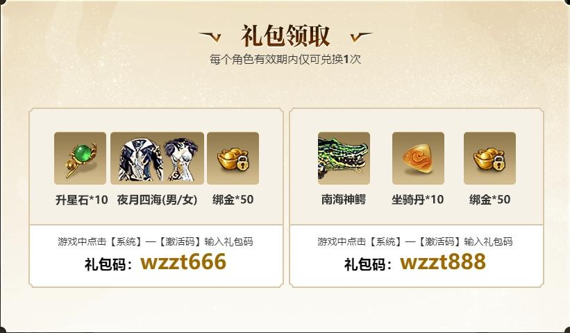 通用礼包码福利:wzzt666、wzzt888,输入后可兑换豪华游戏道具。