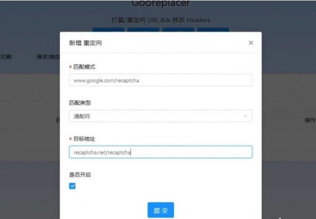 匹配模式:(http://www.google.com/recaptcha)目标地址:(http://recaptcha.net/recaptcha)。