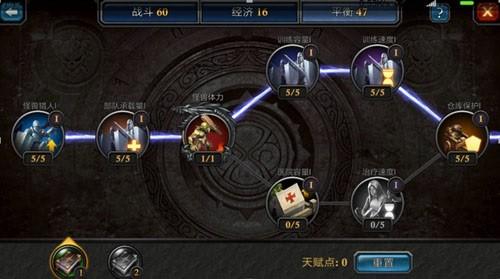 平衡天赋在发展过程中起着很大作用,因为它在发育时对各个建筑的属性加成包括医院容量、训练速度和其他很多地方都有加速和提升。这个加点也建议全部往后面加。加点稍微复杂的就是战斗天赋的加成,另外一点大家记得注意使用天赋技能,比如使用立即生产立马从城里田中收取五小时采集量,使用三秒回兵坑打你的人这些都是很实用的技能。