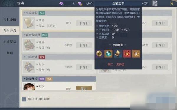 1、参加皇家竞答,堆集日常活跃度,解锁白银密令奖赏,提高各大区域的探究度,能够轻松囤起一船舱的地中海宝图。