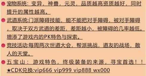 竞技活动:每周两次世道大会,帮派挑战,道友的战场,散人的天堂。