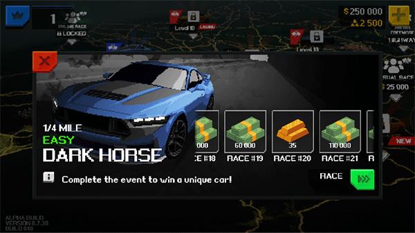 1、在游戏主页,可以选择给车辆改装,换色,购买新车等等,点击race即可开始赛车