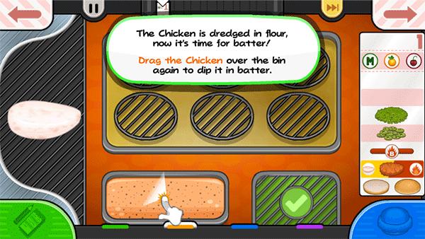 给鸡肉涂上各种面包屑和面糊选项,然后将鸡肉放入油炸锅中烹饪至完美!Papa Louie需要在竞争中获得优势,所以随着时间的推移,他可能会开始引入除鸡肉以外的其他食物来炸!