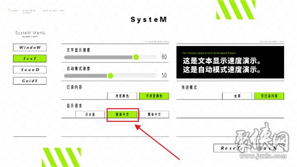 在游戏标题界面点击MenU--SysteM--TexT--简体中文,即可修改语言为中文。