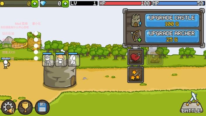 1、进入成长城堡游戏后,可以升级城堡和升级普通弓箭手来提升战力。