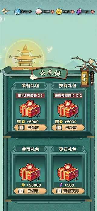 各类装备、技能、金币、灵石礼包都在这里,奖励随机,每日可免费刷新一次。