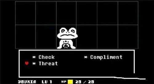 4、去到北面的藤蔓房间内会遇到青蛙froggit,选择“行动——赞美”,虽然青蛙不知道你在说什么,但他变得很开心,他就会逃离战斗。在右面的水池上有一个尖刺陷阱,Toriel会牵着你的手通过这个陷阱区域。
