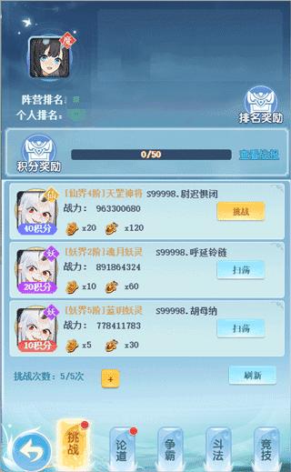 初始5次挑战次数,次数未满情况下每2小时恢复1次,也可通过消耗仙玉购买次数,战胜不同难度的对手,获得的积分与奖励不同;高段位挑战失败会掉积分,请慎重选择对手,玩家每天需手动领取上一日的段位奖励,夫妻积分是由夫妻双方的个人积分组合而成,每一赛季结束后,都会在周一0:00发放夫妻积分榜奖励(无伴侣将无法获得夫妻积分榜奖励)