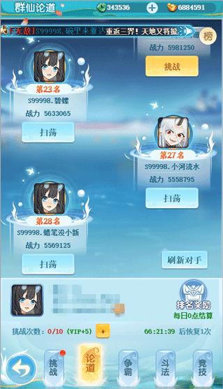 3、论道:扫荡比自己战力低的玩家,如果免费次数使用完了,继续挑战需要消耗仙玉购买。每日0点结算排名,可获得功勋和真气,功勋可在三界宝库兑换珍贵道具,真气用于修炼仙法,提升仙法等级。
