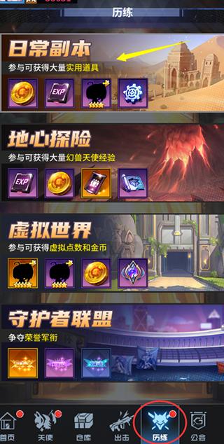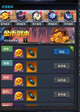 目前日常副本分为金币副本(15级开放)、经验副本(17级开放)、碎片副本(18级开放)、神兽副本(20级开放)、手环副本(70级开放),你可以在这里获取大量游戏资源;