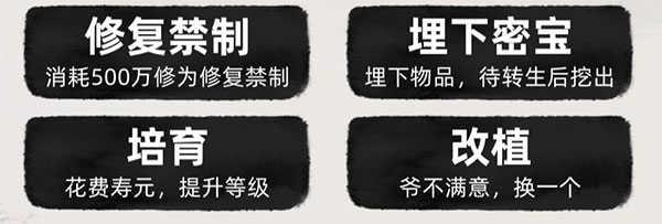 4、炼化法宝可以开启洞府功能,在洞府中可以注入寿元种植草药,收获的草药可以在丹炉中修炼丹药