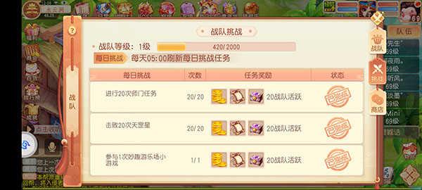 每天战队有6个挑战任务,4个单人的,2个团体的,团体的必须最少和一名战队人员完成!每天5:00会刷新每日的挑战任务,会引导大家去完成游戏内的一些日常任务,为了战队,再也不能偷懒啦!
