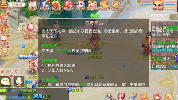 做完主线和师门任务就到30级了,然后就可以参加很多日常活动了。首先就是回合游戏最常说的抓鬼活动,也就是四海平乱,最少需要3个人,最多5个人组队完成,每天前40次获得多倍奖励,之后可以继续完成获得单倍经验奖励。(前几天每天可以完成220个,以后每天大概就100个左右,之后每次就几百经验了就没必要做了。)