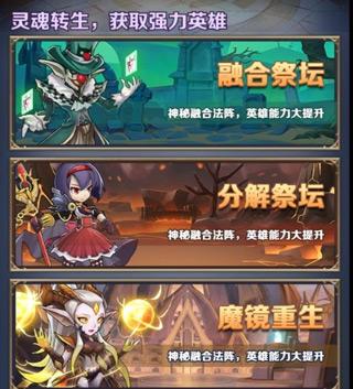 主城【灵魂书院】分为融合祭坛(合6星)、分解祭坛(分解垃圾英雄)、魔镜重生(恢复英雄碎片返还全部材料)