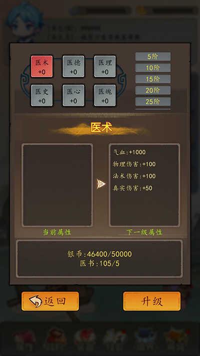 医道:升级(除了提升海量属性加成还有经验加成)。