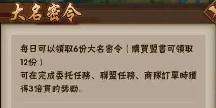 做委托任务时记得使用大名密令,每天刷到上限之内,不然每天的免费密令领不了,勾选大名密令使用调遣军令快速完成高等级委托是前期升级大头,搭配盟书,武士薪俸,常胜战旗特权使用能够达到收益最大化,是日常游玩的一大助力。