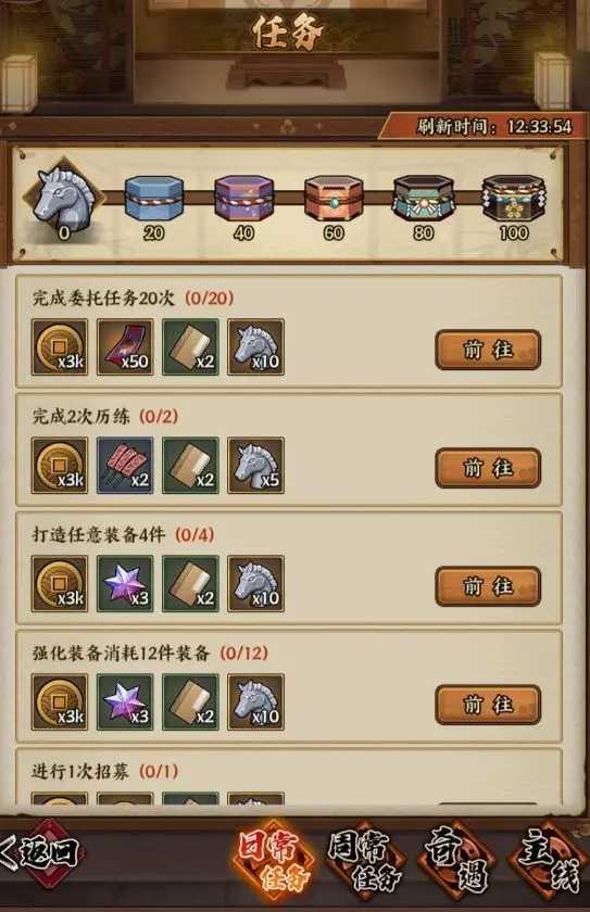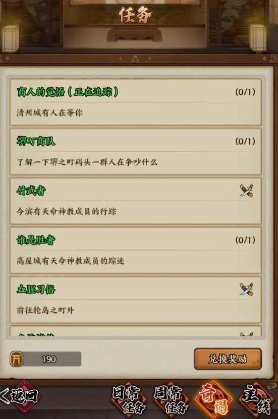 游戏中还有特殊的奇遇任务,玩家通过完成奇遇获得道具与特殊货币,货币可在下方“兑换奖励”处兑换自己需要的道具(招募武将的菊酒、强化装备的符文等)与金币。