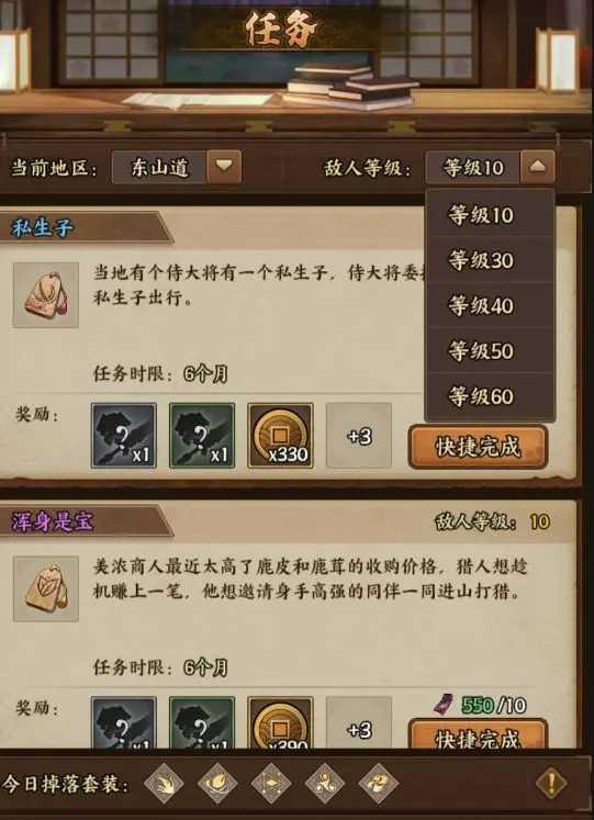 大名密令每天记得刷到上限之内,不然每天的免费密令领不了,勾选大名密令使用调遣军令快速完成高等级委托是前期升级大头,搭配盟书,武士薪俸,常胜战旗特权使用能够达到收益最大化,是日常游玩的一大助力。