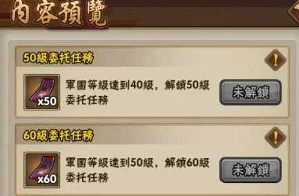 解锁委托任务后快速将军团升到十级来解锁更高级委托任务,武将二十级后去锻冶屋打造全套三阶装备能穿很久,后面也可消耗材料进行升阶,材料不够的朋友可以选择材料特惠包,也可穿委托任务装备来进行过渡,相对会卡一段时间关卡。锻冶屋的三阶武器装备