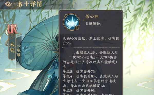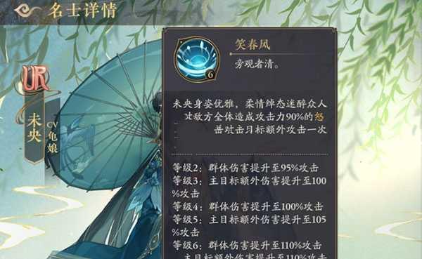 中未央虽然是一个UR品质的卡,拥有非常高的属性面板,但她技能的定位并不明确。被动和普攻都是针对单体敌人,而大招却是群体输出(伤害低于普攻),因此她的强度仅位于T3级别,不建议大家对她进行培养。大家如果有合适的SSR输出角色的话,可以考虑将其替换掉。