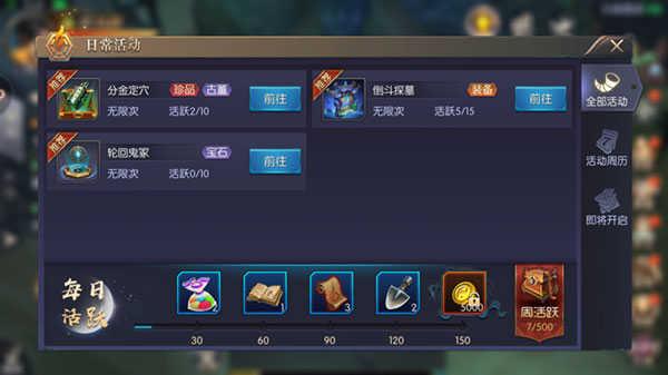 跑主线到20级时,会开放分金定穴、倒斗探墓、轮回鬼冢三个日常任务,可以在跑主线任务的间隙适当参与日常任务,获取装备,宝石以及一些珍宝,这些日常任务可以获取一定的经验,获取的物品对提升战力也有较大的帮助。之后随着等级的增长,还会开放神异石窟、职业任务、山海经怪等更有趣的玩法,产出大量的经验奖励,直接助飞寻龙!